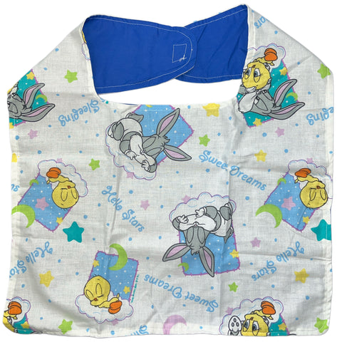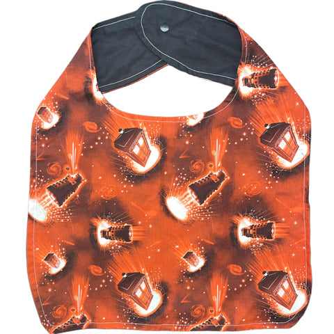 Handmade adult-sized character bib with hook-and-loop fastener for easy adjustment and installation/removal. Unique and one-of-a-kind! Washable and durable 10"x16.5"