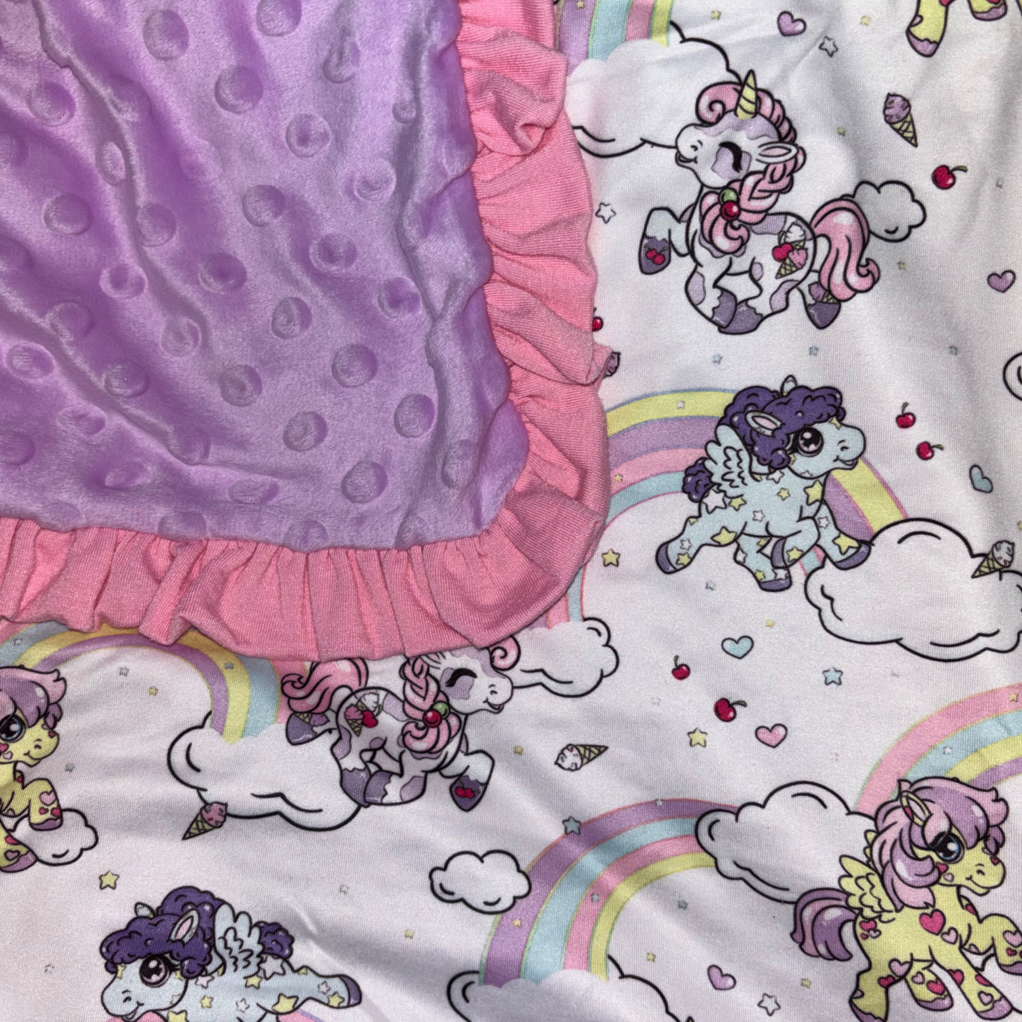 Gallop into comfort! Adorned with graceful little ponies trotting through the sky, this blanket is a sweet escape into a storybook world.