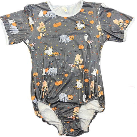 Snuggle up in spooky style with this bodysuit, where comfort meets the crypt! This one-piece is perfect for midnight movie marathons, haunted naps, or just embracing your inner creature of the night. There are 3 metal snaps between the crotch that allows for easy changing. Elastic around the legs for a snug fit. Made with a 4 - way stretchy fabric....