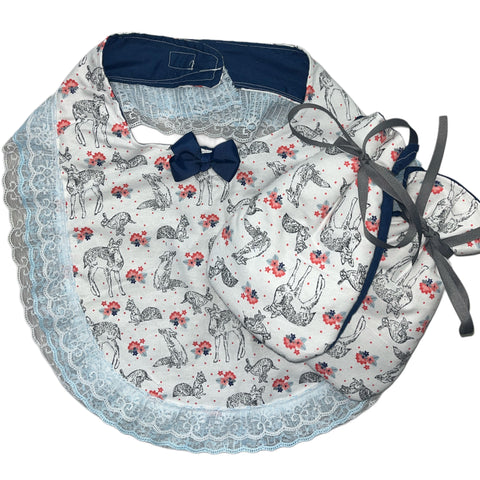 Handmade Bib: Double sided Width 14.5” Length 22” Mittens: Padded Length 10” Width 5” Wrist Width 3” Adjustable strap on wrist