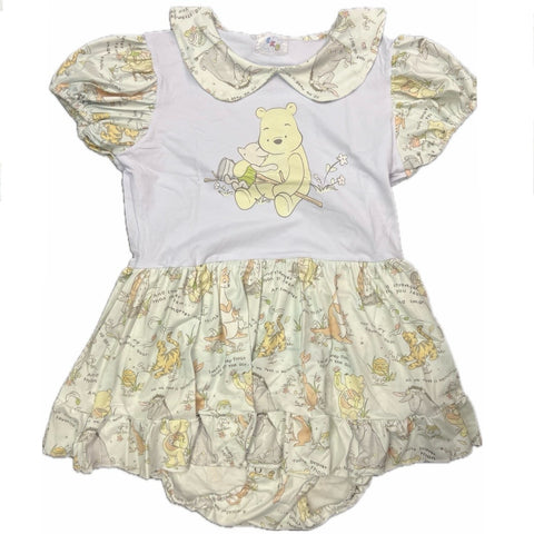 Made with lightweight seersucker fabric and featuring everyone's favorite silly old bear, this dress is full of soft charm and classic comfort. With delicate ruffle details, a gentle fit, and just a touch of Hundred Acre Wood magic, it's ideal for picnics, playdates, or twirling through a field of flowers. •Material- Cotton/spandex Blend •Care Instructions- Machine washable. Machine dry on...