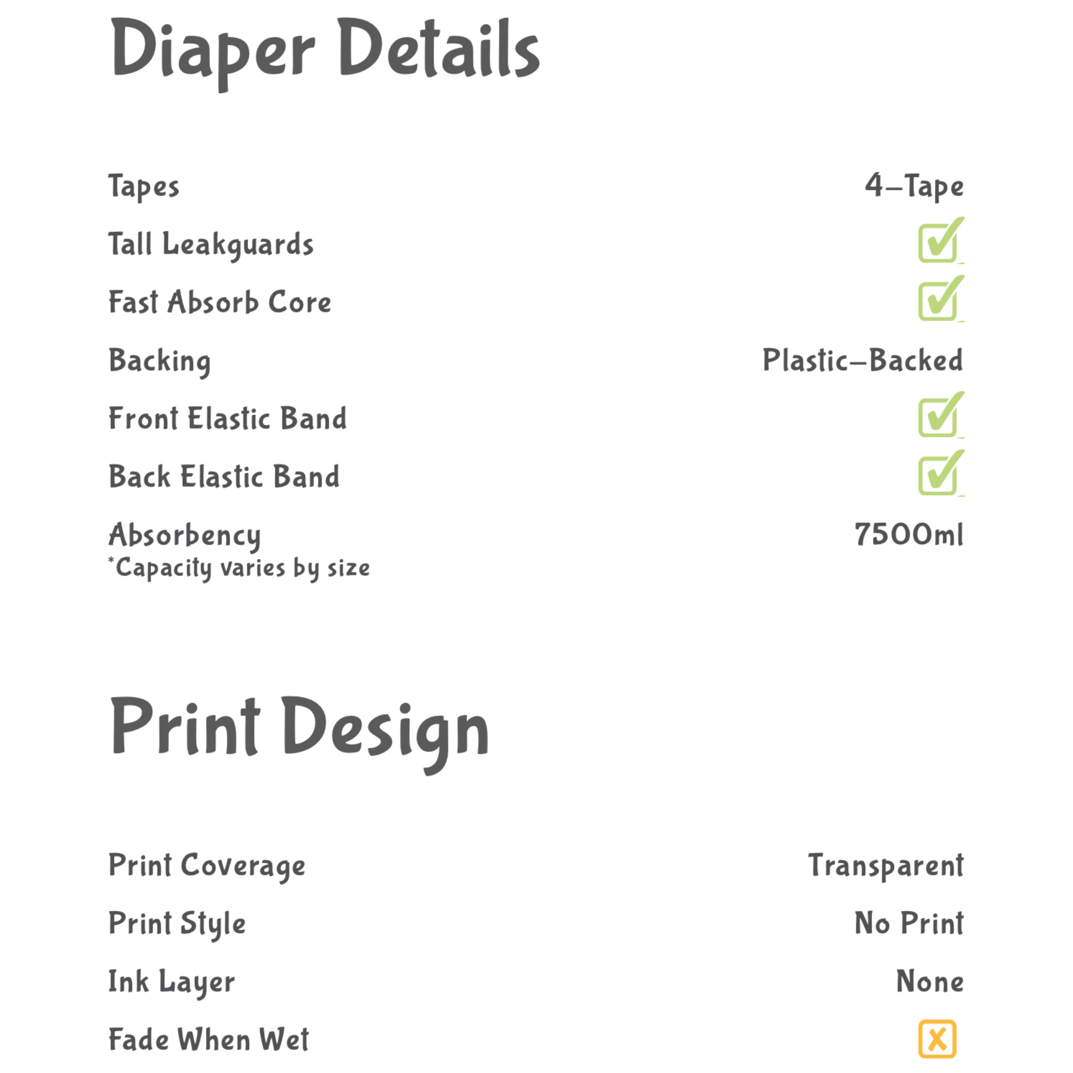 Just like our newest, and probably shyest diaper ever, PeekABUs, these all-white, plastic-backed diapers pack some Ultra-impressive perks! Over 7500ml capacity, super grip tapes, and a slimmer, lighter design will keep you dry when it counts and last longer than those other “ultra” diapers. Simply put, these are ultra-awesome diapers and we made them just for you!