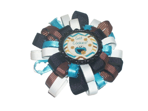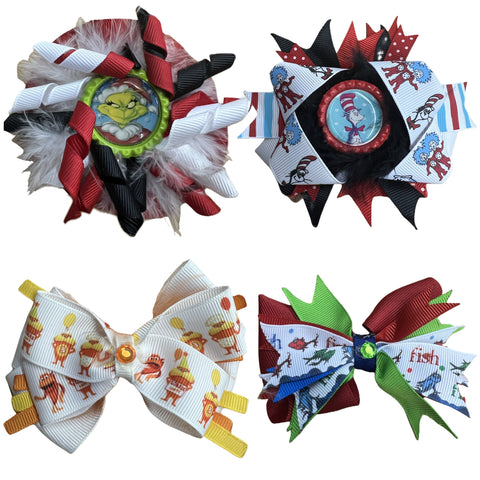 These are hand stitched hair bows using 5/8, 7/8" - 1" grosgrain ribbon. A 1" flattened bottle cap is hot glued onto the bow.Photo is covered with clear epoxy dome. As they are handmade, hair bow will differ slightly in size and style. No two are exactly the same!