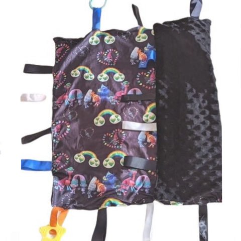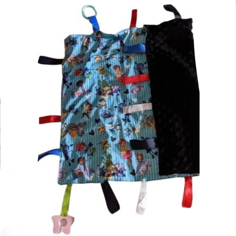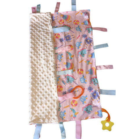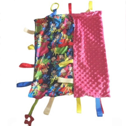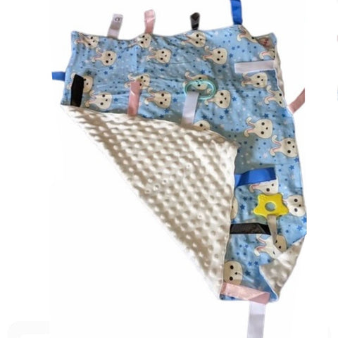 Sensory stimulate, the tag security blanket features super soft material. It soothes anxious feelings, stimulates the senses Super soft dotted plush fabric  Hand wash is recommended Size: 23.5" x 19.5"