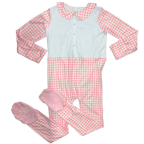 Slip into these snug and soft pajamas to feel like you're wrapped in a warm hug all night long. *Snap on top may tear fabric, be extra gentle when handling snap!*-Zipper from Chin to Crotch.   -Care instructions: Machine wash inside out in cold water. Lay flat to dry -Material: 90% cotton & 10% spandex