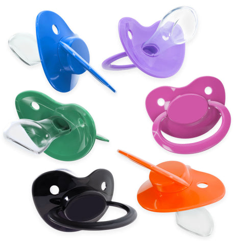 These glow-in-the-dark small shield pacifiers feature a transparent shield. As this pacifier is fully assembled and welded closed it cannot be disassembled. The easy-grab handle is made with high-quality plastic and makes playtime easier and more exciting. The Size 6 is a necessary accessory for ABDL age play, EDM parties, and raves! Pacifiers have been used as a therapeutic trainer for...